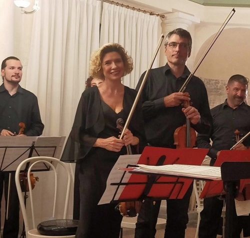 In copertina, Laura Grandi e altri violinisti della Schippers durante il concerto di ieri sera a Castelnuovo di Sagrado; qui sopra, il maestro Carlo Grandi si congratula con l’orchestra al termine della serata.