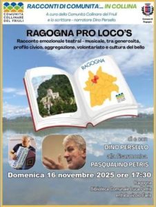 (g.l.) E ora Dino Persello dà appuntamento a due passi da casa. L’attore, ma anche scrittore e narratore, di San Daniele (nativo però della vicinissima Dignano) questa sera sarà impegnato nella contermine Ragogna dove proporrà uno dei suoi cavalli di battaglia preferiti: il valore, il significato e l’importanza del volontariato in una comunità, davvero vitale se questa è piccola e con poche risorse finanziarie. S’intitola, infatti, “Ragogna Pro Loco’s” il racconto emozionale teatral-musiciale in programma alle 17.30 tra generosità, profilo civico, aggregazione, volontariato appunto e cultura del bello. L’incontro con le parole, sempre coinvolgenti, di Dino Persello accompagnate dalla fisarmonica di Pasqualino Petris si terrà nella sala della Biblioteca comunale, Lo spettacolo, come sempre a ingresso libero, è sostenuto dalla civica amministrazione di Ragogna e della Comunità Collinare del Friuli e viene proposto nell’ambito della bella manifestazione culturale “Racconti di comunità… in collina”.