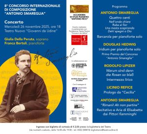 La manifestazione odierna era stata anticipata in maggio quando, nell’ambito della “Setemane de culture furlane”, durante un incontro tenutosi a Villa de Claricini Dornpacher, a Bottenicco di Moimacco, era avvenuta la premiazione della sezione in lingua friulana. Il premio era stato consegnato a Paolo Furlan, autore di “Friul”, dalla nipote del compositore Adua Smareglia Rigotti. Anche in quell’occasione era stato proposto un concerto, con l’esecuzione dell’opera premiata, e alcune liriche smaregliane, protagonisti il soprano Alessia Nadin e la stessa pianista che suonerà stasera, appunto Franca Bertoli.