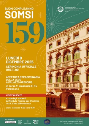 Ad accogliere e guidare i visitatori nella storia e negli spazi di attività della Somsi di Pordenone, Centro di divulgazione culturale riconosciuto dalla Regione Friuli Venezia Giulia, saranno le studentesse dell’Istituto Tecnico per il Turismo “Flora” di Pordenone, uno dei molti Istituti scolastici che collaborano stabilmente con l’Operaia nelle sue numerose attività, mentre alle 11 è in programma la cerimonia ufficiale di benvenuto alla cittadinanza, ai Soci e alle autorità, a cominciare dai rappresentanti degli Enti che sostengono l’iniziativa, come la Regione Friuli Venezia Giulia e il Comune di Pordenone. Sarà questa l’occasione non solo per tracciare una breve sintesi dell’anno trascorso, ma anche per dare le prime anticipazioni delle iniziative che attendono la Somsi nel 2026, anno particolarmente importante perché segnerà il 160° di fondazione, un traguardo di grande significato che non mancherà di portare alla città di Pordenone e al territorio regionale nuove proposte culturali da condividere con la comunità, secondo la storica vocazione del sodalizio verso “le attività e le iniziative rivolte a favorire l’elevazione culturale, sociale e morale dei cittadini”.