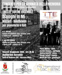 L’Amministrazione comunale di Sesto al Reghena onorerà la Giornata della Memoria, che ricorda tutte le vittime della Shoah, con un concerto del “Trieste Tartini Ensemble” in programma venerdì 30 gennaio, alle 20.45, nel Teatro Burovich. Ingresso libero. Un evento reso possibile grazie alla collaborazione con l’Ensemble Serenissima all’interno dell’FVG International Music Meeting – Tracce e Visioni.