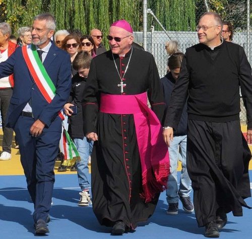In copertina, l’arcivescovo Redaelli con monsignor Nutarelli e il sindaco Corbatto nel 2024 all’inaugurazione del Ricreatorio Spes a Città Giardino.