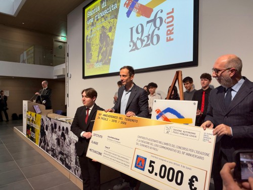 I saluti introduttivi sono stati portati dal rettore dell’Università di Udine, Angelo Montanari, con interventi del sindaco di Gemona e presidente dell’Associazione Comuni del Terremoto Roberto Revelant e del presidente del Consiglio regionale Mauro Bordin. Nel corso della cerimonia il governatore Fedriga ha premiato il vincitore del concorso promosso dalla Protezione civile regionale e aperto alle classi quarte e quinte dei Licei artistici e Istituti tecnici ad indirizzo Grafica e Comunicazione della nostra regione. Fedriga ha assegnato il riconoscimento a Davide Giroldo, della classe 5E (sezione Grafica) del Liceo Artistico “Galvani” di Cordenons per aver creato il miglior logo commemorativo che rappresentasse la memoria dell’evento sismico, la resilienza della comunità, il percorso di rinascita e il legame con il territorio. Fedriga ha sottolineato che «è molto importante che le nuove generazioni siano protagoniste dell’anniversario del terremoto. Questo logo, oltre a dimostrare la grande capacità dei nostri ragazzi, rappresenta simbolicamente un ponte che attraversa cinquant’anni di storia della nostra terra, che non vuole far vivere un ricordo di quei momenti drammatici e della ricostruzione semplicemente come un doveroso ricordo del passato, ma come una forte testimonianza nel presente. Lo spirito della ricostruzione deve continuare a impregnare le radici del nostro popolo, perché dimostra la vera forza di questa terra». Il logo vincitore – premiata con 5mila euro la classe – è composto da tre segni gestuali, nei colori della Protezione civile e nel giallo, simbolo di forza e rinascita: il primo richiama il territorio, il Monte San Simeone e la leggenda dell’Orcolat; il secondo rappresenta il Friuli distrutto e le macerie; il terzo simboleggia la resilienza e la rinascita. Il logo accompagnerà le attività della Regione Fvg per tutto il 2026, anche quelle non direttamente connesse all’anniversario del terremoto.