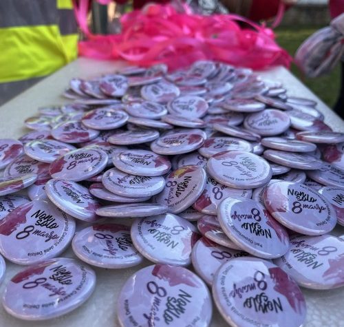 In copertina, i distintivi della “marcia in rosa” organizzata a Casarsa per la Festa internazionale della Donna.